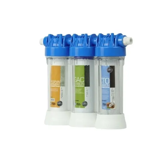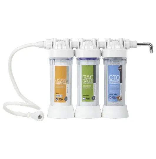 HSC Arıtım Üçlü Musluk Tipi Filtre Seti (Triplix) Musluğa doğrudan bağlanan pratik tasarımı ile ek bir cihaza ihtiyaç duymadan kısa sürede kurulabilir ve anında arıtılmış su konforu sunar. Kompakt yapısı mutfak kullanımına uygundur ve yer kaplamaz.